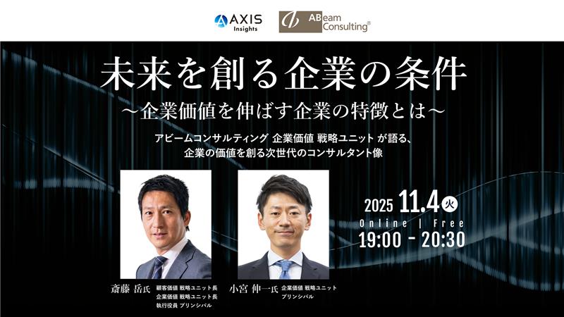 当社は、2025年11月4日(火)午後7時より、アビームコンサルティング株式会社 顧客価値 戦略ユニット長/企業価値 戦略ユニット長/執行役員 プリンシパル 斎藤 岳氏と、企業価値 戦略ユニット プリンシパル 小宮 伸一氏をお迎えし、「未来を創る企業の条件 ~企業価値を伸ばす企業の特徴とは~」を開催いたします。