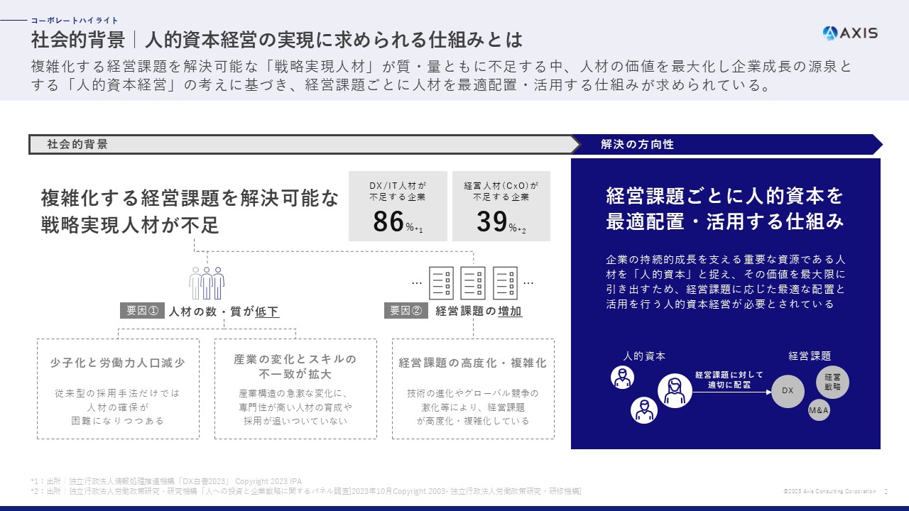 複雑化する経営課題を解決可能な「戦略実現人材」が質・量ともに不足する中、人材の価値を最大化し企業成長の源泉とする「人的資本経営」の考えに基づき、経営課題ごとに人材を最適配置・活用する仕組みが求められています。