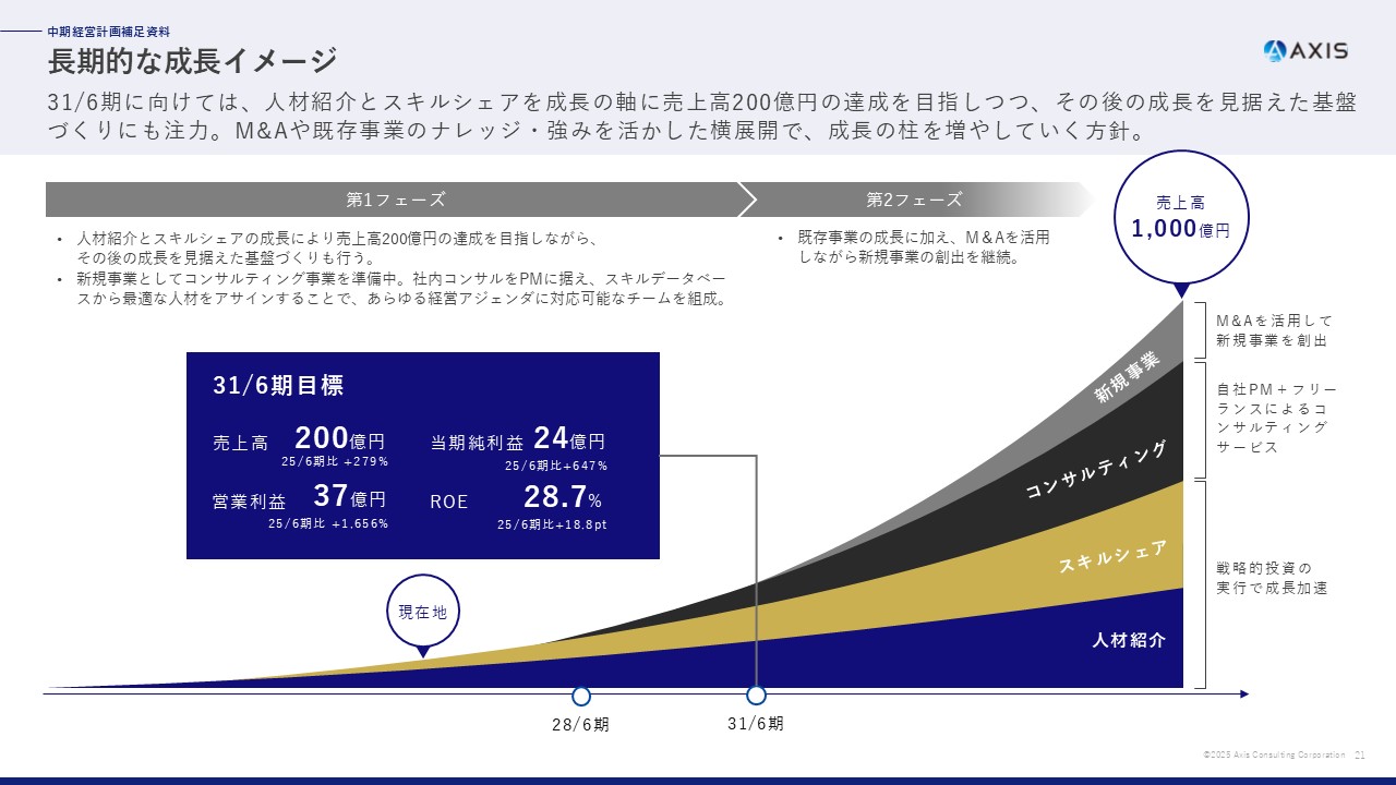 31/6期に向けては、人材紹介とスキルシェアを成長の軸に売上高200億円の達成を目指しつつ、その後の成長を見据えた基盤づくりにも注力。M&Aや既存事業のナレッジ・強みを活かした横展開で、成長の柱を増やしていく方針です。