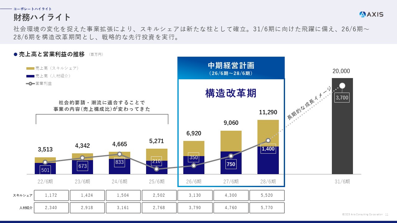 社会環境の変化を捉えた事業拡張により、スキルシェアは新たな柱として確立。31/6期に向けた飛躍に備え、26/6期~28/6期を構造改革期間とし、戦略的な先行投資を実行しています。