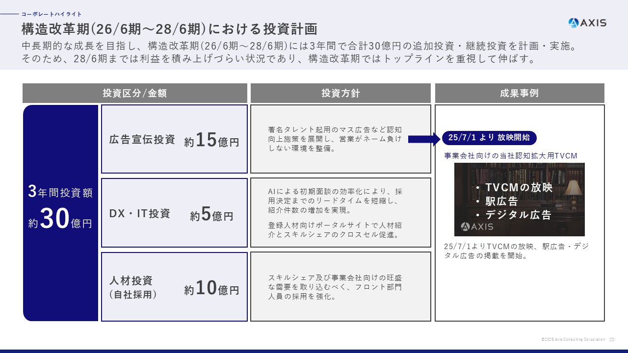 中長期的な成長を目指し、構造改革期(26/6期~28/6期)には3年間で合計30億円の追加投資・継続投資を計画・実施。そのため、28/6期までは利益を積み上げづらい状況であり、構造改革期ではトップラインを重視して伸ばします。