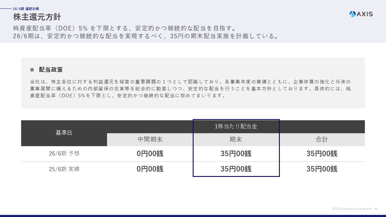 当社は、株主各位に対する利益還元を経営の重要課題の1つとして認識しており、各事業年度の業績とともに、企業体質の強化と将来の事業展開に備えるための内部留保の充実等を総合的に勘案しつつ、安定的な配当を行うことを基本方針としております。具体的には、純資産配当率(DOE)5%を下限とし、安定的かつ継続的な配当に努めてまいります。